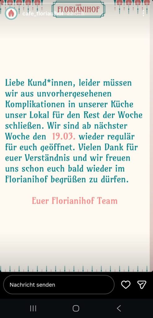 „Liebe Kund*innen, leider müssen wir aus unvorhergesehenen Komplikationen in unserer Küche unser Lokal für den Rest der Woche schließen. Wir sind ab nächster Woche den 19.03. wieder regulär für euch geöffnet. Vielen Dank für euer Verständnis und wir freuen uns schon euch bald wieder im Florianihof begrüßen zu dürfen.