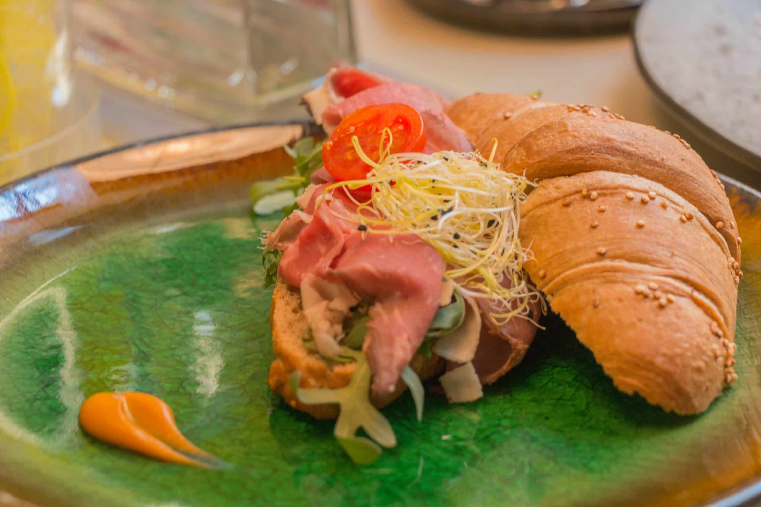Das Stilbruch setzt darauf den ganzen Tag dort essen zu können. Daher darf ein ausgiebiges Frühstücksangebot nicht fehlen und bereits hier beginnen die etwas eigenen Kreationen. So zum Beispiel das Croissant, welches auf den klingenden Namen “Fleisch” hört. Zutaten hier sind ein Quinoa-Dinkel Croissant mit Roastbeef vom Tafelspitz, Honig-Senf-Butter und roten Zwiebeln.