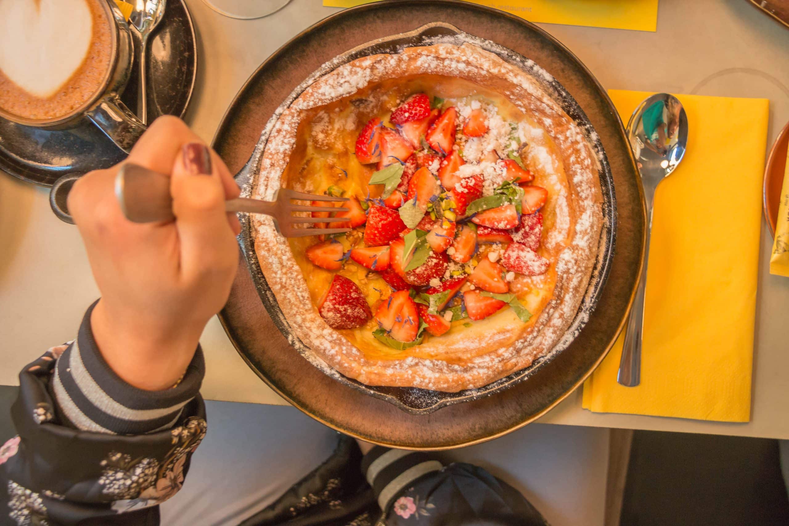 Auch Süßspeisen können einen anderen Kniff bekommen und heißen dann zum Beispiel Zucchini Schokoladenbrot und werden mit einer gebratenen Ananas serviert. Oder auch “Dutch Baby” (“Kaiserschmarrn goes Pancake”) welches entweder mit Bratapfel, Vanillesauce und Salzkaramell, mit Erdbeeren und Earl Grey Eis oder mit Mascarponecreme, Kirschragout und Schokosplitter erweitert werden kann.