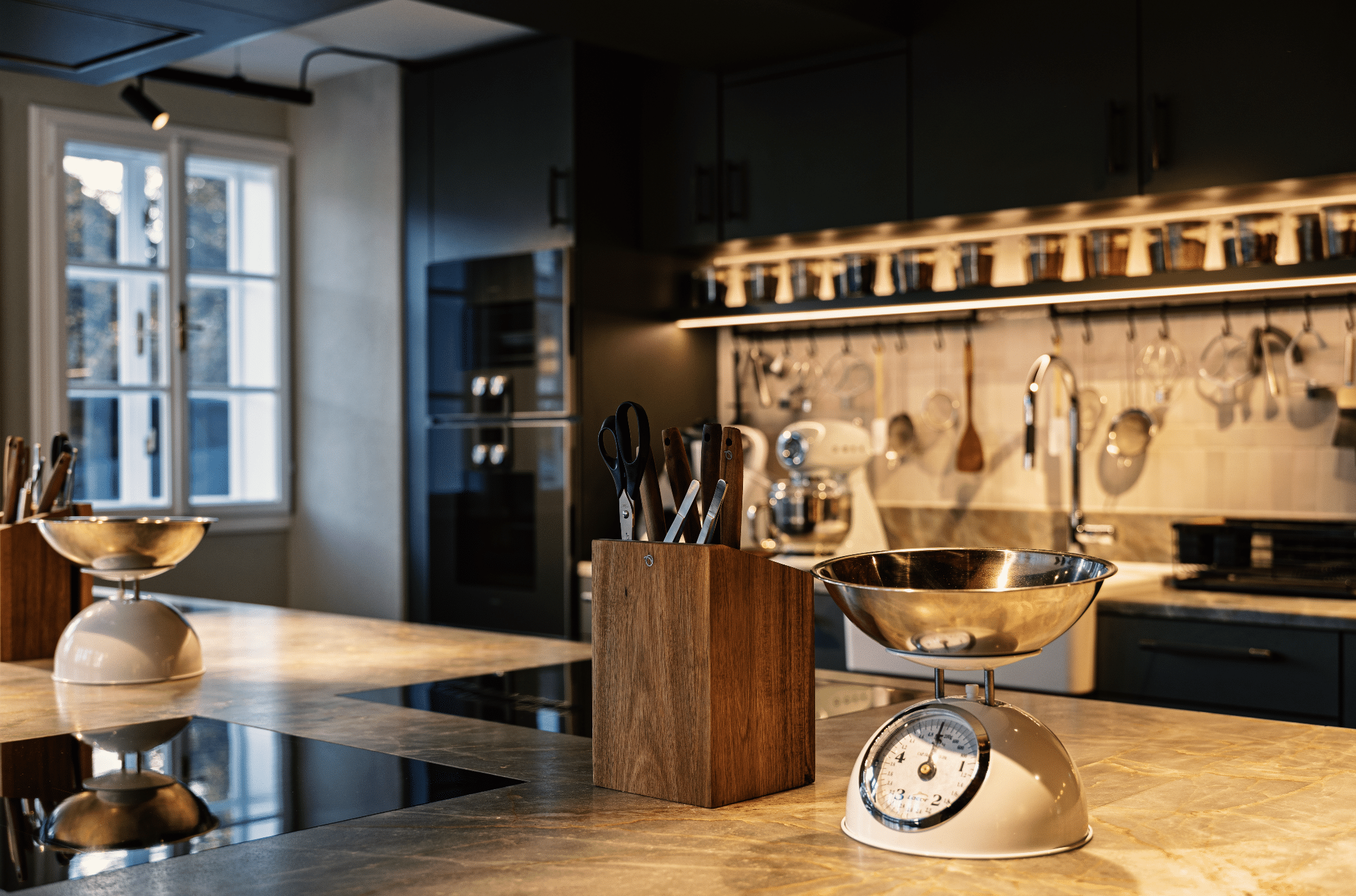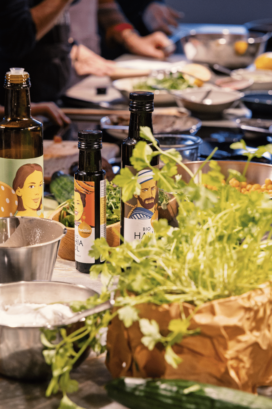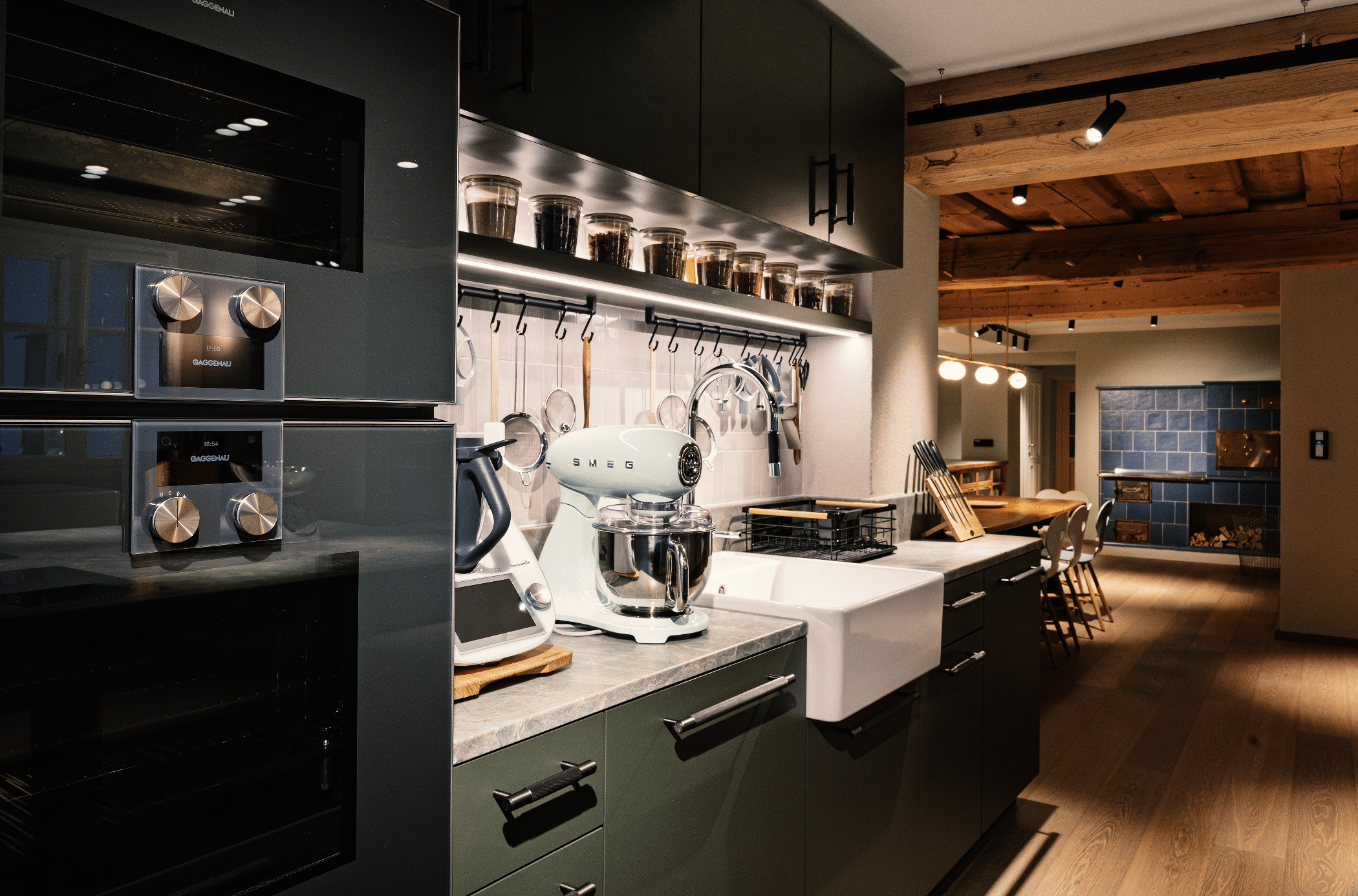 Damit die erlernten Techniken und Rezepte auch zu Hause problemlos umsetzbar sind, wurde die Küche der Kochschule mit vertrauten und hochwertigen Geräten ausgestattet. Induktionsherde von Gaggenau, SMEG-Geräte im Retro-Design, ein Thermomix und edle Pfannen von Olavsson bieten optimale Bedingungen für das Kocherlebnis.