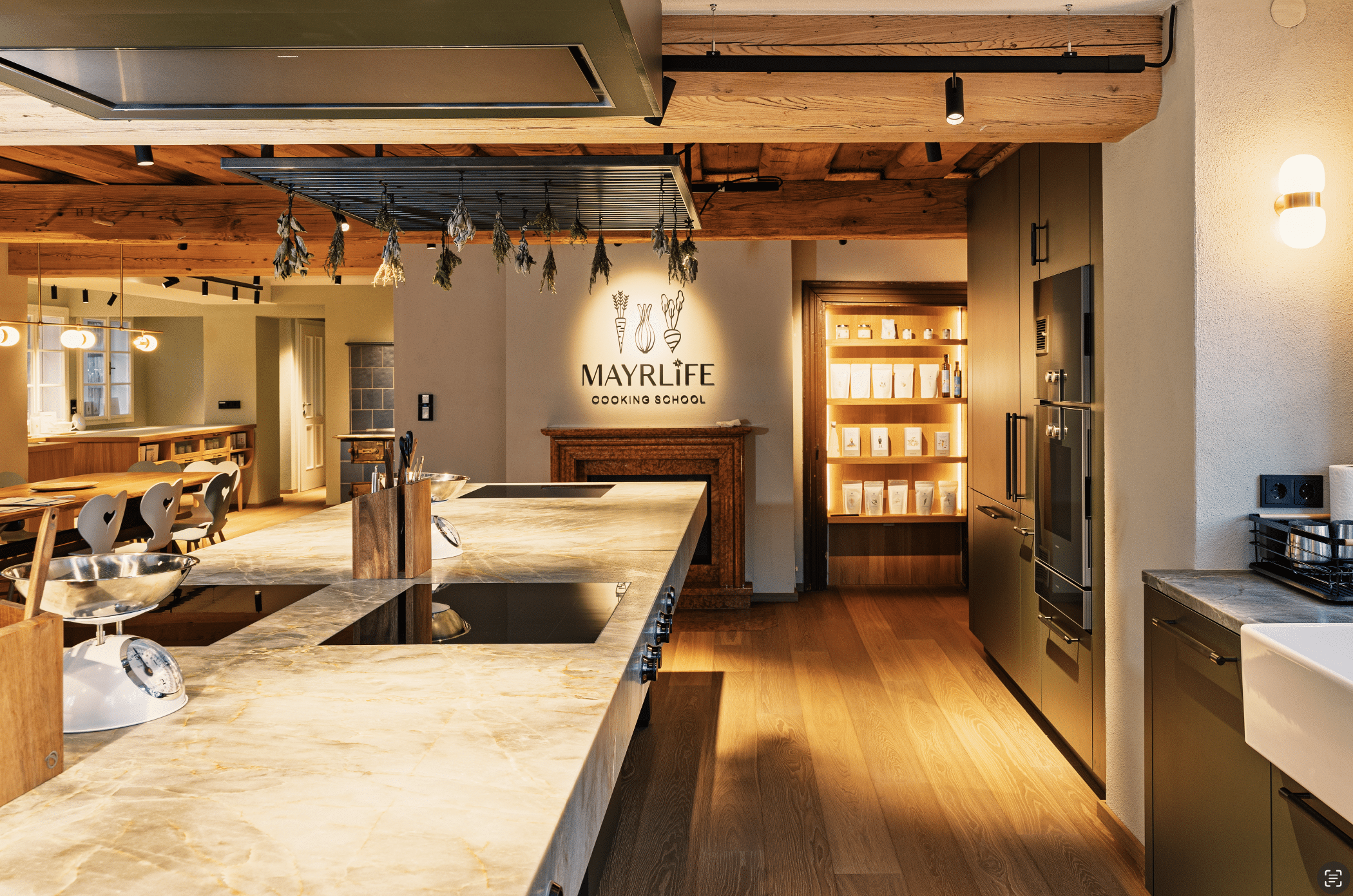 Das Konzept von MAYRLIFE steht für eine zu 100 % personalisierte Ernährungsstrategie, die sowohl gesund als auch genussvoll ist. In der neuen Kochschule, die sich in einem stilvoll gestalteten separaten Haus befindet, können Gäste unter Anleitung erfahrener Köche lernen, wie sie diese Genussrezepte auch zu Hause umsetzen können. Dabei steht die Alltagstauglichkeit im Mittelpunkt: Die speziell für die Kochkurse entwickelten Rezepte sind etwas einfacher gehalten als die im Resort servierten Gerichte, sodass sie problemlos nachgekocht werden können.