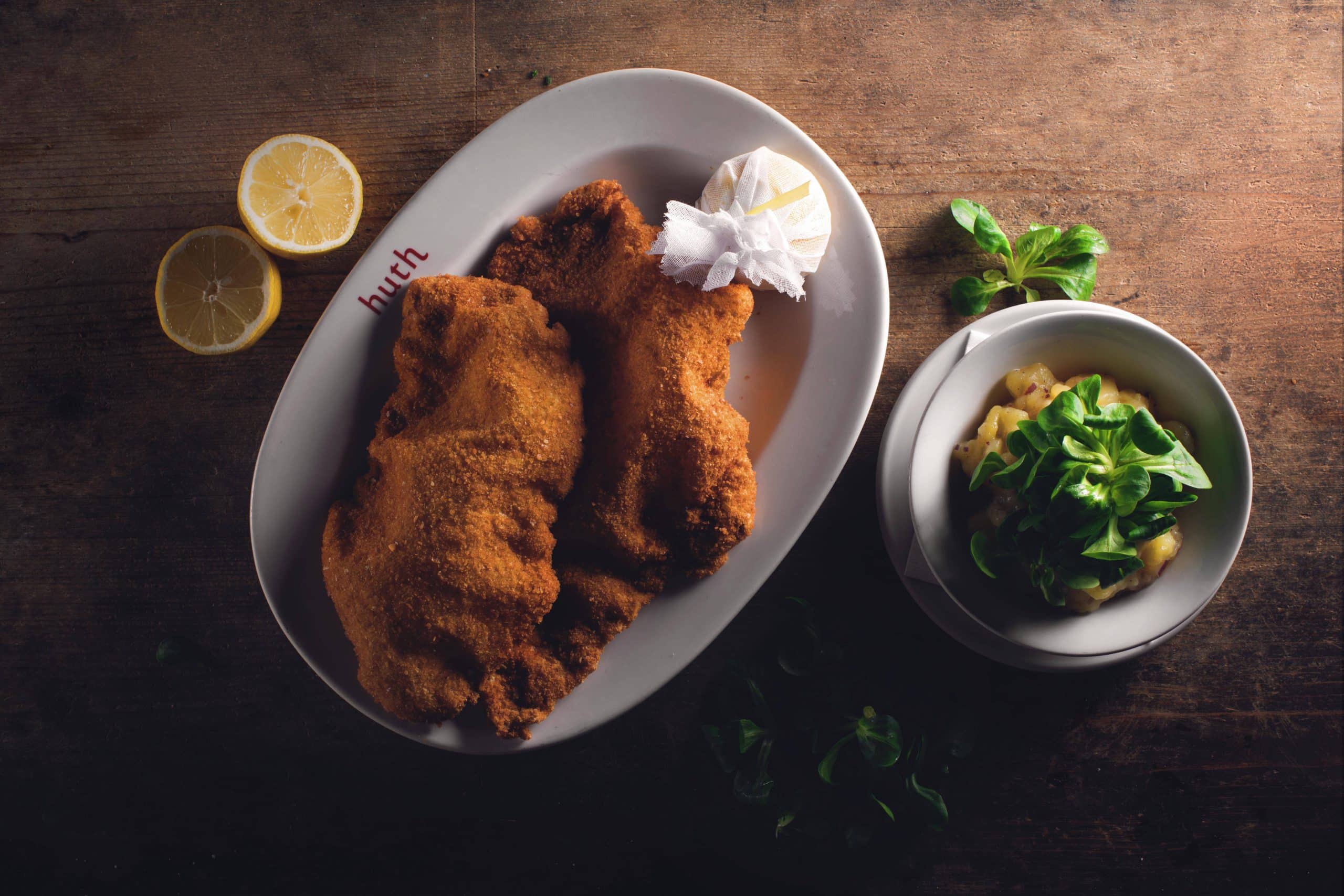Auch die Huth Gastwirtschaft verzichtet nicht auf den Wiener Klassiker vom Kalb. Wie alle überbackenen Gerichte wird auch das Schnitzel mit Erdäpfel-Vogerlsalat und Zitrone serviert, dazu empfohlen werden zudem die hauseingelegten Preiselbeeren – eine gängige Kombination der Wiener Küche.