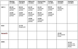 Fernsehen kann einfache Unterhaltung bieten und auch interessantes Wissen vermitteln. Gerade diesen Sommer haben vermutlich viele Zeit die Rezepte von Starköchen nach zu kochen und informative Beiträge zu verfolgen. Kochen, Gastronomie und Genuss ist unsere Passion. Für all jene die diese Passion teilen, hat Gastro News alle Sendungen der nächsten Woche zusammengesucht, die ganz im Zeichen des Genuss-Wissens stehen. Wir wünschen Ihnen viel Spaß mit dem Programm.