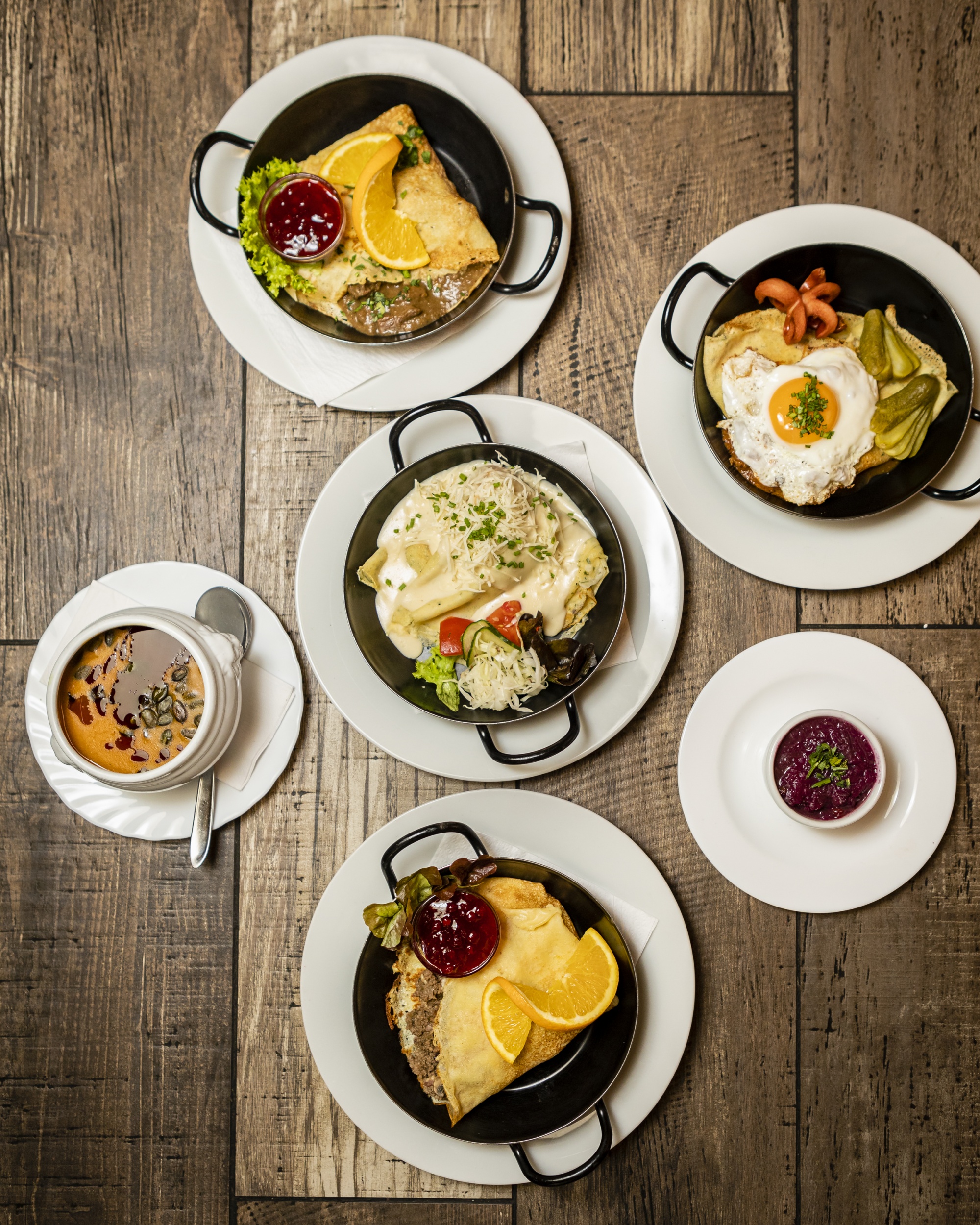 Kulinarisch spannt sich der Bogen von herzhaften Klassikern wie Kalbsrahmgulasch oder Wiener Schnitzel bis zu süßen Spezialitäten, allen voran Kaiserschmarren und Palatschinken in zahlreichen Varianten. Neben den Fixpunkten der Karte sorgen monatlich wechselnde Spezialitäten für saisonale Akzente, ohne den traditionellen Rahmen zu verlassen. Auch neu interpretierte Gerichte – etwa Palatschinken mit internationalem Einschlag – fügen sich unaufgeregt ins Konzept ein.