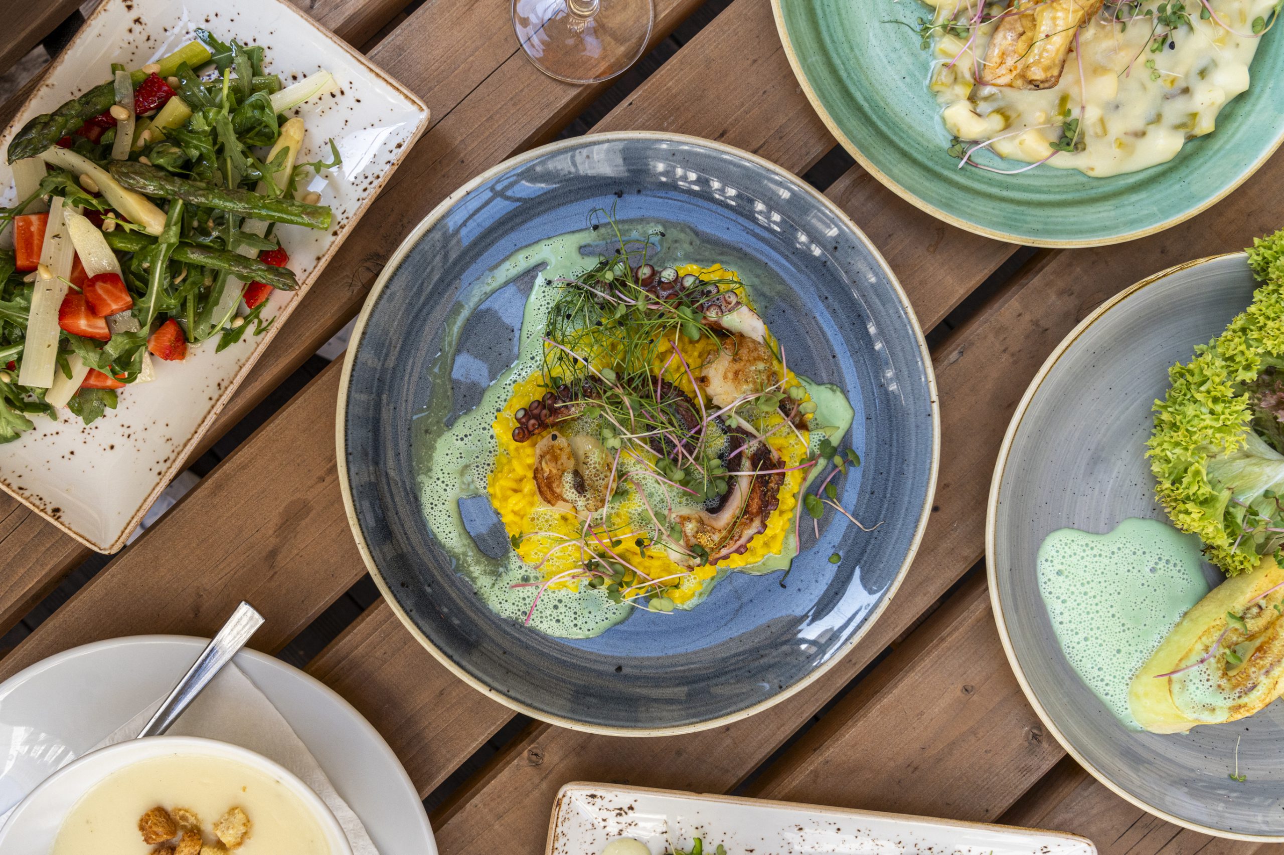 Auf der Speisekarte finden sich klassische Vorspeisen wie Tzatziki, Tarama oder Baba Ganoush, ebenso wie raffiniertere Starter à la Beef Tatar mit Senf-Eis, geflämmter Ziegenkäse im Kataifi-Mantel oder Zweierlei vom Thunfisch als Ceviche und gegrillt. Meeresfrüchte spielen eine zentrale Rolle – von Calamari Fritti über gegrillte Jakobsmuscheln bis hin zu Rote Gambas oder mariniertem Oktopus. Auch Vegetarier:innen kommen auf ihre Kosten: Ricotta-Ravioli, Burrata mit Rote-Rüben-Gnocchi oder vegane Oliven-Falafel zeigen, dass fleischlose Küche hier keineswegs Nebensache ist. Bei den Hauptspeisen reicht die Auswahl von Gyros vom Huhn à la Ellas über rosa gebratene Entenbrust und geschmorte Lammstelze bis zu Fischklassikern wie Branzinofilet oder einer großzügigen Fischplatte für zwei. Wer sich nicht entscheiden möchte, wählt das 6-Gänge-Menü, das quer durch die aktuelle Ellas-Küche führt.