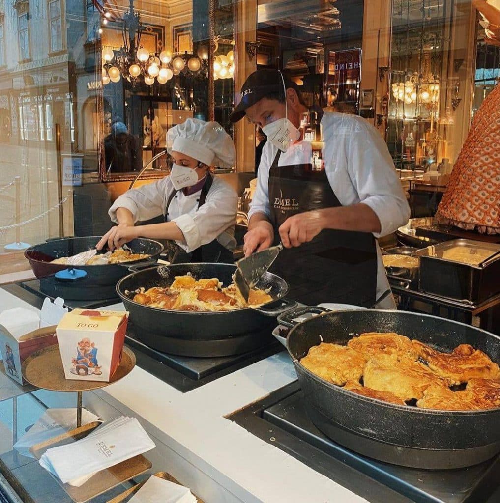 Tradition kann leicht und spontan sein – das beweist der Demel mit seinem Kaiserschmarrn to go. Statt Silberbesteck und Porzellanteller gibt’s hier den ikonischen Wiener Klassiker im Becher: frisch aus der Pfanne, karamellisiert, flaumig und perfekt portioniert für unterwegs.