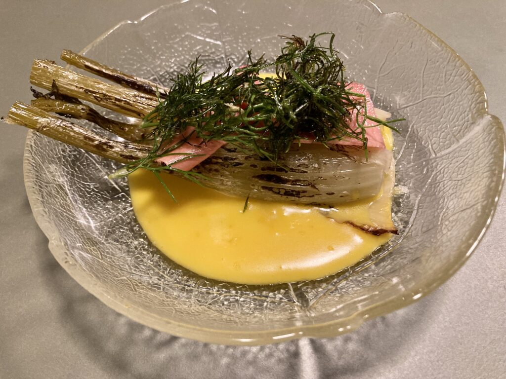 Für Service & Wein sind sind Lina & Beni zuständig. Guter Start: Prickelndes von Zuschmann-Schöfmann, gefolgt von Markus Altenburger, Weninger und einigen spannenden, teils alkoholfreien Begleitungen. Allesamt passend zu einer Gemüseküche mit Wumms. Gebeizter Kohlrabi wird mit Zitrusvielfalt (Quelle: Orangerie Schönbrunn) kombiniert, junger Sellerie in Lacto Koji-Fond gegart, Fenchel mit Safran Veloute liegt eingelegter Ingwer bei; Gersten-Risotto, Chicorée, Yuzu (Koji a la Risotto) und der Germknödel mit geräuchertem Topinambur gefüllt, Chinakohl und Zwetschke waren meine Highlights. Und das einzige Fleischgericht: Gefüllte Maultaschen.