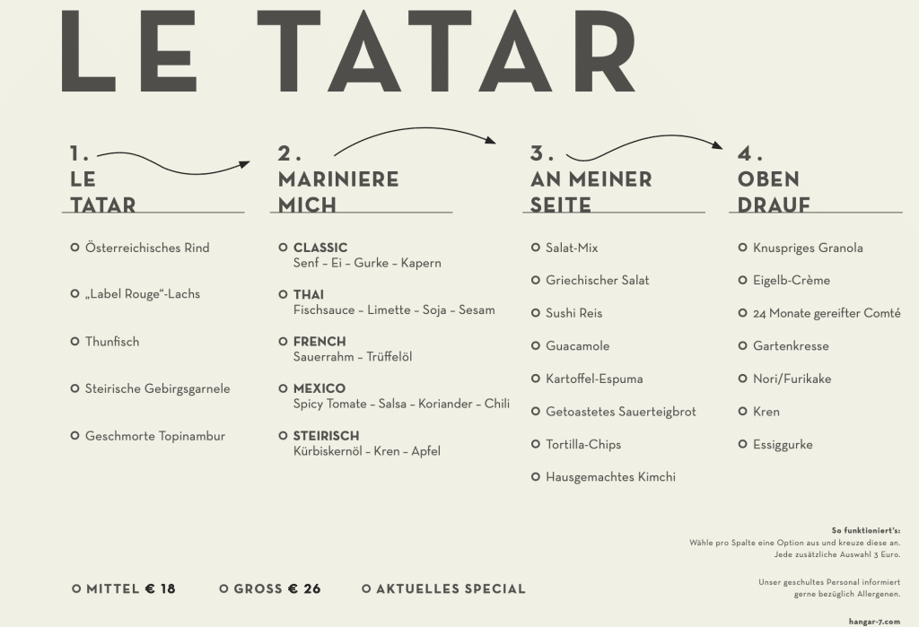 Mit „Le Tatar“ setzt der Hangar-7 während der vorübergehenden Schließzeit ein weiteres kulinarisches Highlight und verkürzt so genussvoll die Wartezeit bis zur Wiedereröffnung. In der charmanten Tagesbar, gelegen in der traditionsreichen Getreidegasse 47, dreht sich alles um die hohe Kunst der Tatar-Zubereitung. Der Name ist hier Programm: Gäste können sich auf eine geschmackliche Entdeckungsreise begeben und das klassische Rindertatar in seiner traditionellen Form genießen oder eine der kreativen Alternativen wählen. Neben feinstem Lachs- und Thunfischtatar stehen auch Steirische Gebirgsgarnelen sowie eine raffinierte vegetarische Variante mit geschmortem Topinambur zur Auswahl.