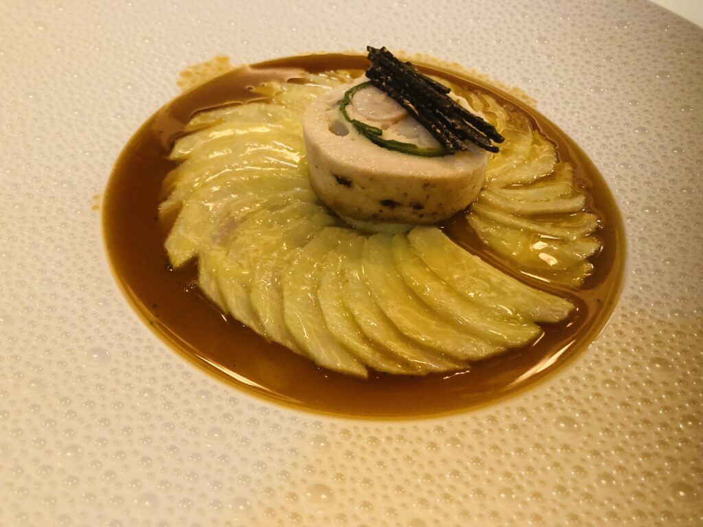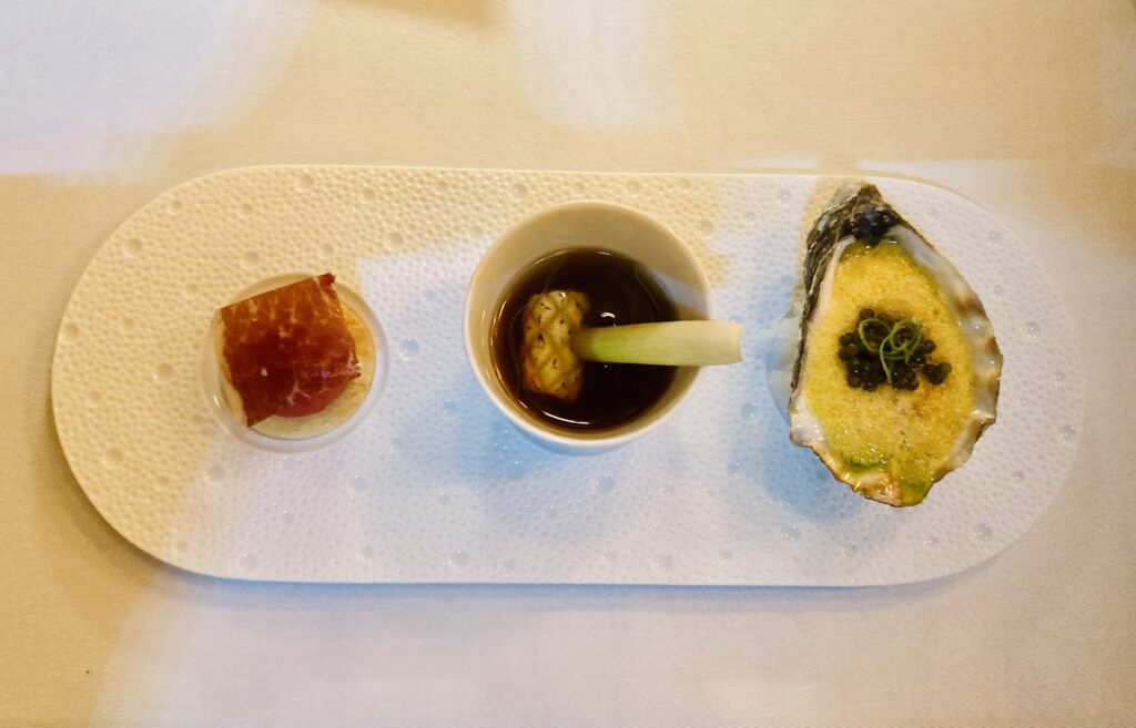 Diskret abgegrenzt in einer Nische befindet sich ein Tisch – getauft Community-Table – des Fine-Dining-Bereichs. Wir starten mit – hätten Sie’s gewußt – Amuse Bouche. Dicht und aromatisch kommt die Iberico-Consomme, der Zitronengras Frische & Säure verleiht. Genial, die lauwarme Gillardeau-Auster, darauf Knochenmark, dekoriert mit etwas Kaviar. Ein Gericht mit Stil und Schmelz. Dazu reicht das spielfreudig aufgelegte Sommelier-Team Louis Roederer Rose 2017.