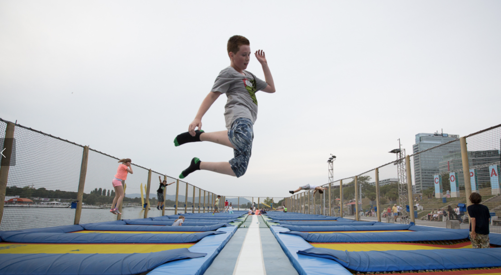 In der Mäanderzone darf mit Matsch und Sand geformt werden. Kleine Kapitäne und Kapitäninnen bewegen Wasser mit Windrädern, bauen Staudämme, beobachten, wie sich der Bachlauf verändert. Und wenn genug geplanscht wurde, gibt es Duschen, Fußduschen, Bänke, Liegen. Auch einen eigenen Bereich für Kinder bis drei, mit Holzspielgeräten, Sonnensegel und Umzäunung. Etwas weiter nordwestlich liegt der Familienbadestrand. 250 Meter feiner Kies, sanft abfallende Uferzonen, vorgelagerte Mini-Inseln und ein Meter Wassertiefe. Kein Eintritt. Dafür ein Spielplatz, Toiletten, ein Eisstand, ein Restaurant. Wer noch höher hinaus will, findet bei der Reichsbrücke „Danube Jumping“ – die größte schwimmende Trampolinanlage der Welt. 40 Felder, Luft unter den Füßen und Wiens Skyline im Blick.