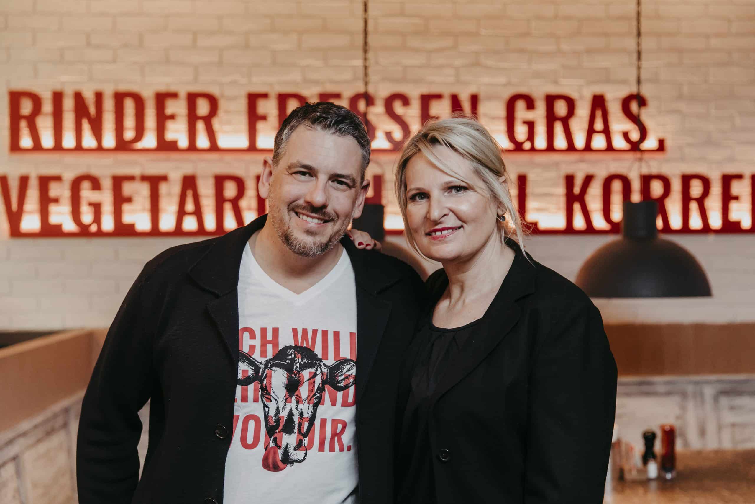 lecker machen. „Burger aus bestem Stall“ und „Qualität aus Österreich“, lautete die Philosophie des trendigen Burgerlokals. „Rinder fressen Gras. Vegetarisch voll korrekt.“ steht an der Wand und überall scheinen Kühe mit großen, roten Zungen auf die Besucher herunter zu lachen. Eigentlich ist das Erfolgsprinzip des Lokals ziemlich einfach und knackig kurz: „Es war einmal ein Rind. Und aus.“