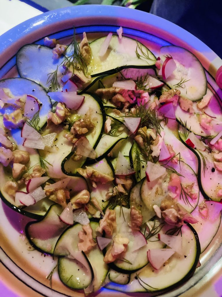Florian Gassmann, unter anderem im Rinkhy, Serviceleiter im Cafe Kriemhild zu letzt beim Reznicek und Alina Stantejsky, im Marketing tätig und ebenfalls mit Gastro-Erfahrung wollten ihr eigenes Ding. Das Konzept: Naturbelassene Weine plus feine Kleinigkeiten zu Essen. Der Schwarzbrot-Toast kommt etwa mit gefreitem (vielleicht auch GEREIFTEM) Emmentaler aus Vorarlberg vom Sutterlüty, Zucchini-Carpaccio erfrischt mit Radießchen und Nüssen, das Schwarzbrot mit Verwackertem vom heimischen Fisch zeigt, wie man Heurigenküche intelligent neu interpretieren kann.