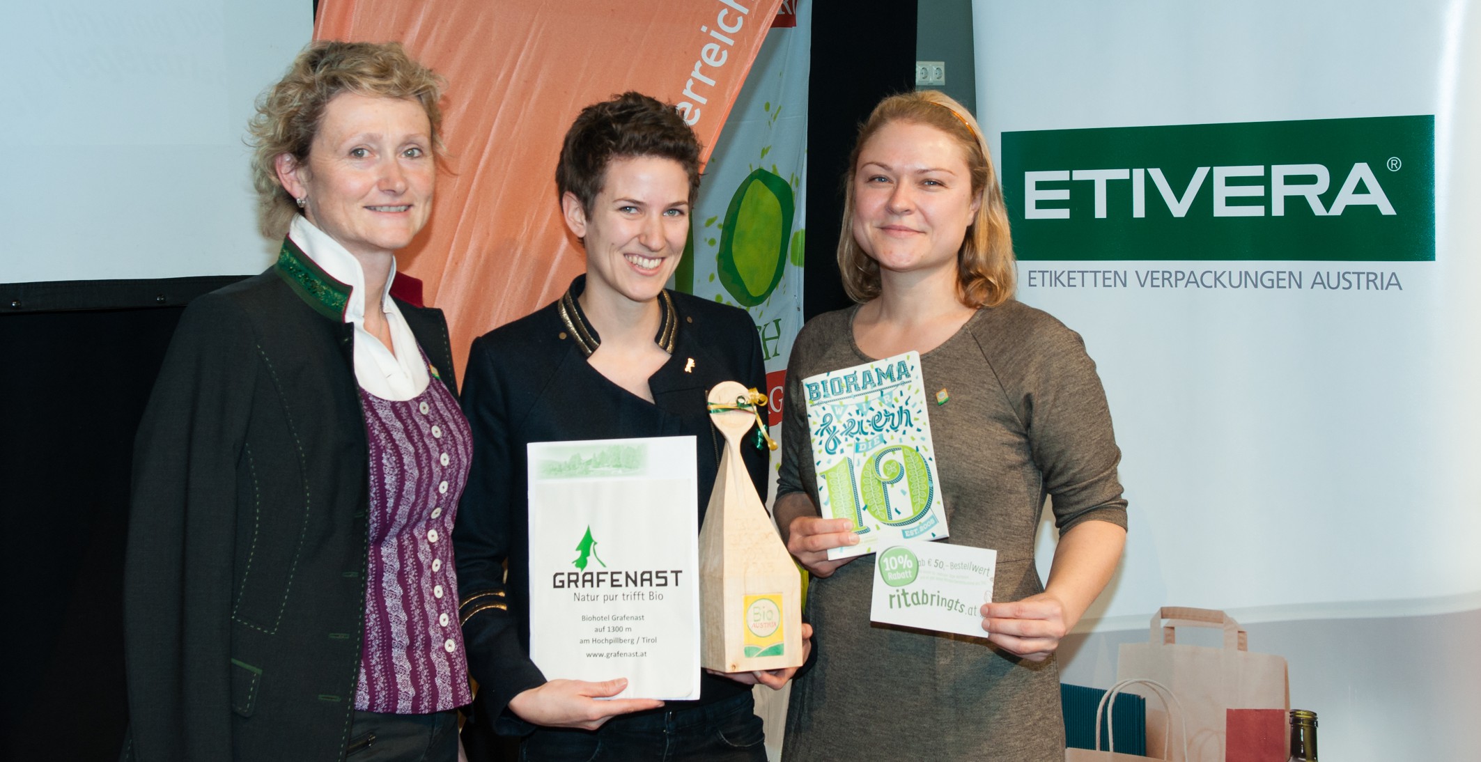Beide Bio-Gastronomen dürfen sich neben dem Sieg über je eine Woche Erholung in Form eines Aufenthaltes im Bio-Hotel Grafenast (Tirol) bzw. im Natur & Bio Familienhotel Benjamin (Kärnten) freuen. Übergeben wurden die Preise von BIO AUSTRIA Obfrau Gertraud Grabmann, BIO AUSTRIA Geschäftsführer DI Markus Sandbichler und DI Verena Auberger, Marketing und Vertrieb BIO AUSTRIA Niederösterreich und Wien.