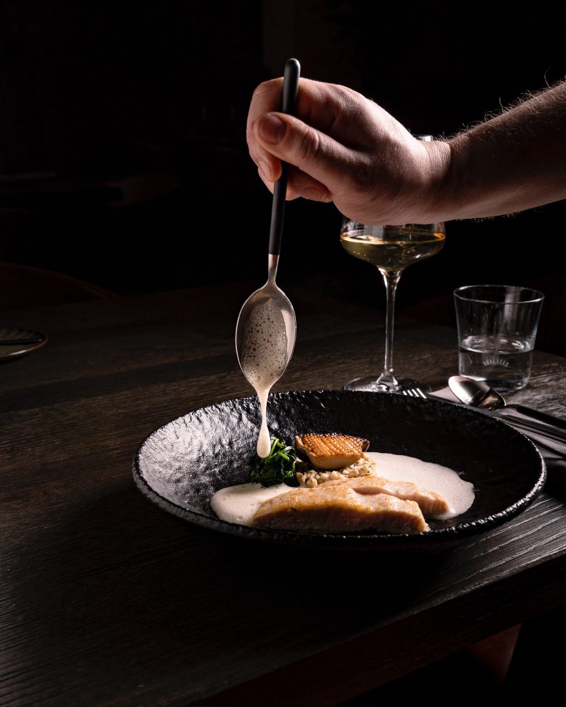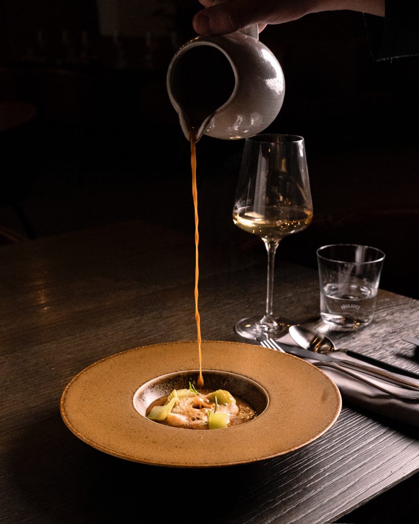 Eine samtige Bisque aus Kaisergranat, geprägt von verspielten Aromen und feiner Röstaromatik. Die maritime Süße des Fangfrischen wird von einer strukturierten Würze begleitet, die den Charakter des Gerichts abrundet.