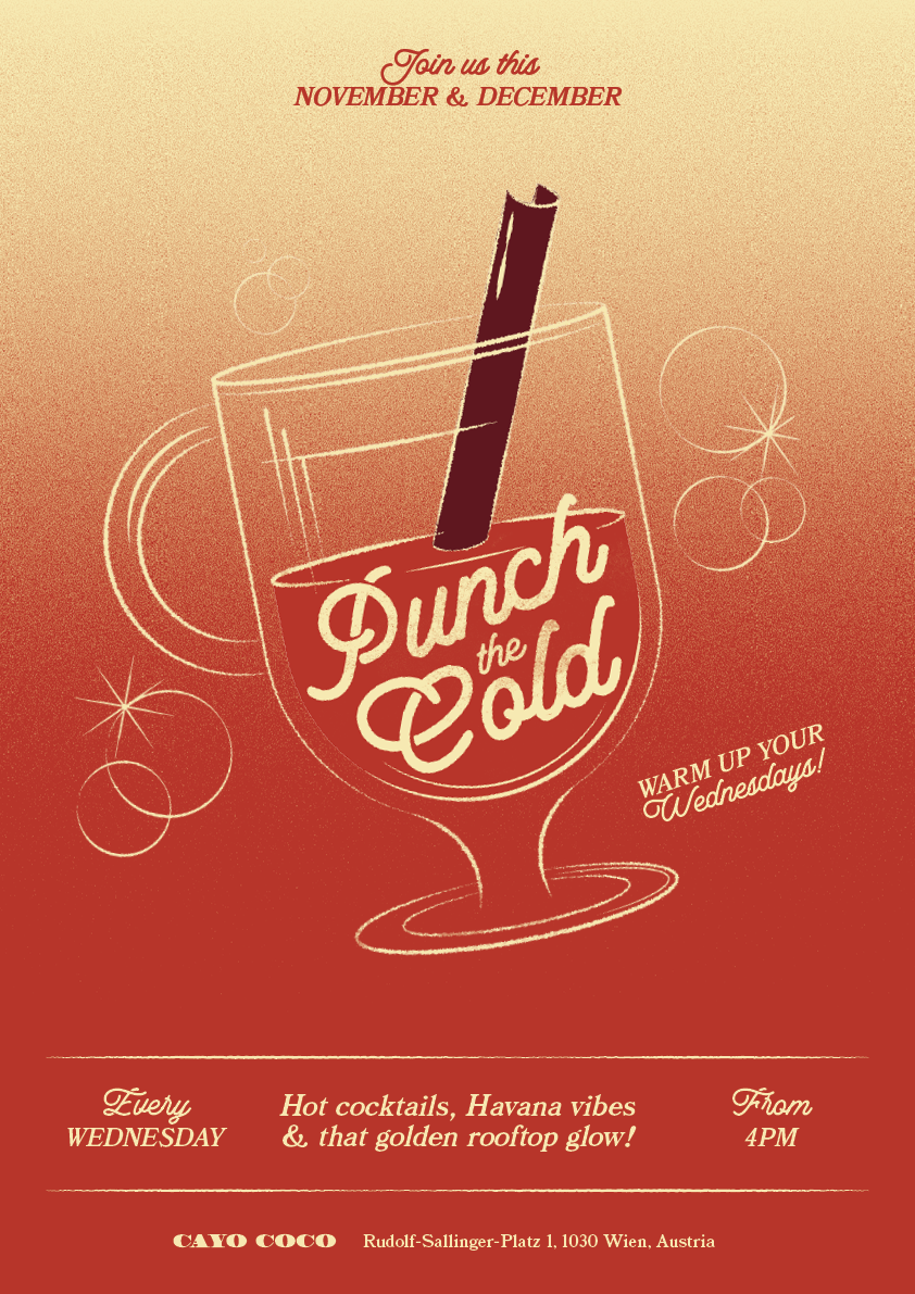 Wenn draußen Winter ist, wird’s am Rooftop von Cayo Coco richtig warm: „Punch the Cold“ bringt dir jeden Mittwoch ab 3. Dezember karibische Wohlfühl-Vibes über den Dächern Wiens. Heiße Cocktails, tropische Aromen, entspannte Musik und dieser unverwechselbare Cayo-Glow – irgendwo zwischen Afterwork und Wintermarkt, perfekt für alle, die’s cozy aber stylish mögen.