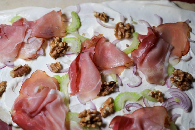 2.Den aufgegangen Teig noch einmal kräftig kneten und für weitere 10 Minuten ruhen lassen. Mehl auf der Arbeitsfläche verteilen, den Teig in 4 gleich große Stücke aufteilen und gleichmässig dünn nach und nach ausrollen. Backofen auf 250 Grad vorheizen. Backblech mit Backpapier auslegen und den ausgerollten Teig darauf legen. Den Teig mit der Sauerrahm-Creme fraîche Mischung bestreichen und mit Zwiebeln, Walnüssen, Stangensellerie und Schinkenspeck gelegen.