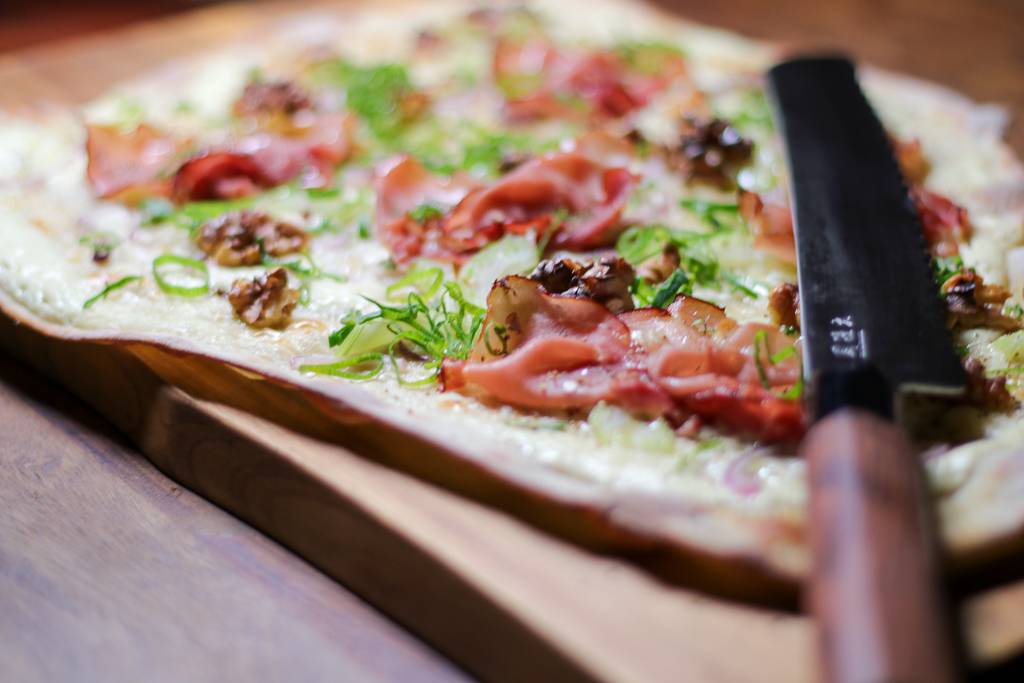 Flammkuchen mit Schinkenspeck, Walnüssen und Trüffelöl