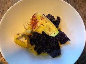 Küchenchef Lukas Stagl hat eine kluge Küchenlinie rund um’s Feuer, das auch eine Steinplatte sowie einen Holzbackofen erhitzt, konzipiert. “Raw and Fire” nennt er sein Konzept. Er möchte Essen unverfälscht lassen, “der Fokus liegt auf den Produkten. Ich möchte den Urgeschmack auf den Teller bringen”. “Schweinereien” etwa liefert Hans Schmölz, XO-Beef kommt von Robert Weishuber, Käse von Robert Paget. Auf der Dogenhof-Homepage sind die jeweiligen Produzenten angeführt. Außerdem legt der junge Küchenchef besonderen Wert auf Gemüse, das hier in verschiedenen Garstufen und Texturen – knackig, rauchig, röstig – die Hauptrolle spielt. Fleisch gibt es im Dogenhof nur Abends – ein wenig Dry Age, XO-Beef, Geflügel, keine Steaks.
