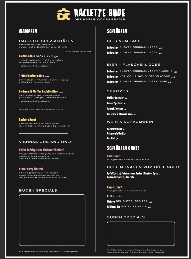 Ab 1. Mai lautet das Motto im Wiener Prater „Say Cheese“, denn ab morgen startet die Soft-Opening-Phase der neu eröffneten „Raclette Bude“!